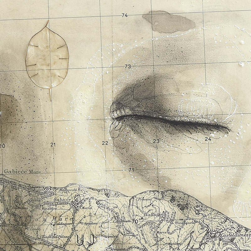 china, carboncino, olio e pastelli su vecchia mappa originale applicata su tavola