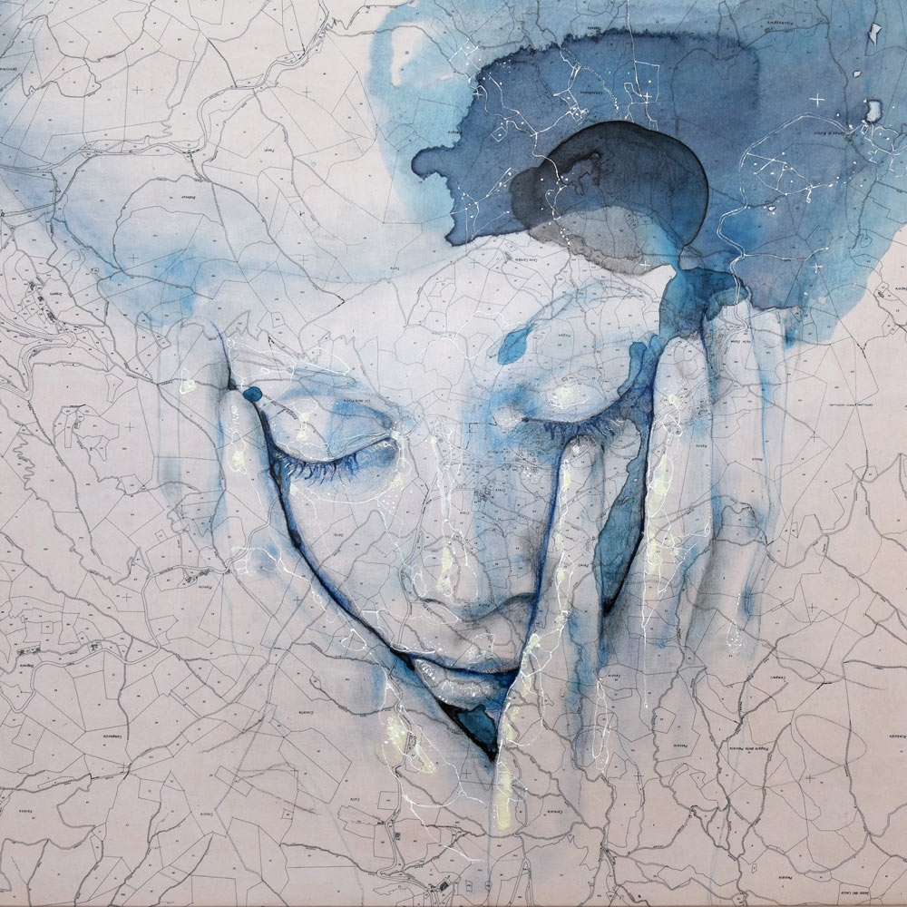 china, carboncino, olio e pastelli su vecchia mappa originale applicata su tavola